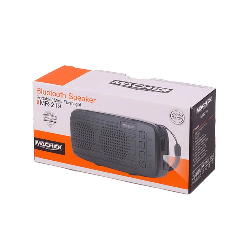 اسپیکر بی سیم قابل حمل مچر مدل MR-219 ساخته شده از متریال پلاستیکی مقاوم در برابر فشار و ضربه، بهره مندی از بند به منظور سهولت در حمل و نقل و قابلیت پشتیبانی از امواج رادیو FM منظور دریافت هرچه بهتر امواج برای دوستداران برنامه های رادیویی را داراست.همچنین این اسپیکر بلوتوثی مجهز به درایو 52 میلی متری با توان خروجی کلی 5 وات، تعبیه چراغ قوه در قسمت جلویی محصول است.اتصال آن توسط رابط بلوتوث نسخه 5٫0 با برد اتصال مفید 10 متری است.قابلیت پشتیبانی از فلش مموری USB و رم میکرو SD جهت پخش فایل های ذخیره شده را نیز دارد.تامین انرژی از طریق باتری داخلی 500 میلی آمپر ساعته قابل شارژ توسط پورت میکرو USB تعبیه شده بر روی بدنه و کابل همراه است و میزان شارژدهی به طور تقریبی برابر با 3 الی 5 ساعت است.