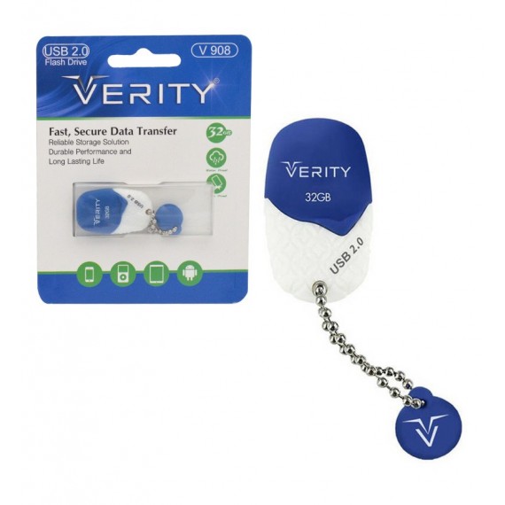 فلش verity v908  دارای رابط از نوع usb 2.0  و ظرفیت 32gb  است که برای ذخیره سازی و انتقال اطلاعاتی چون موسیقی ،فیلم و عکس بسیار مناسب است .بدنه آن از جنس پلاستیک مقاوم است که در برابر رطوبت و اشعه مقاوم است .